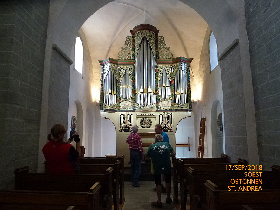 Montag um zehn gings los, die Tour nach Soest startete. Uli führte die zehnköpfige Gruppe über Billmerich, Kessebüren nach Werl zur ersten Pause. Nach einer kleinen Stärkung ging es weiter nach Ostönnen zur St. Andreas-Kirche. Hier öffnete uns der Küster die Kirche, damit die Fahrradgruppe die älteste gängige Orgel der Welt in der schönen romanischen Kirche bewundern konnten. Dann ging es schnell ins Hotel "Stadt Soest". Um 17 Uhr startete die Stadtführung per Rad. Die Stadtführerin gestallte die Tour sehr interessant, durch die alte Hansestadt. Abends saßen die Radler in einem wunderschönen Biergarten zusammen.