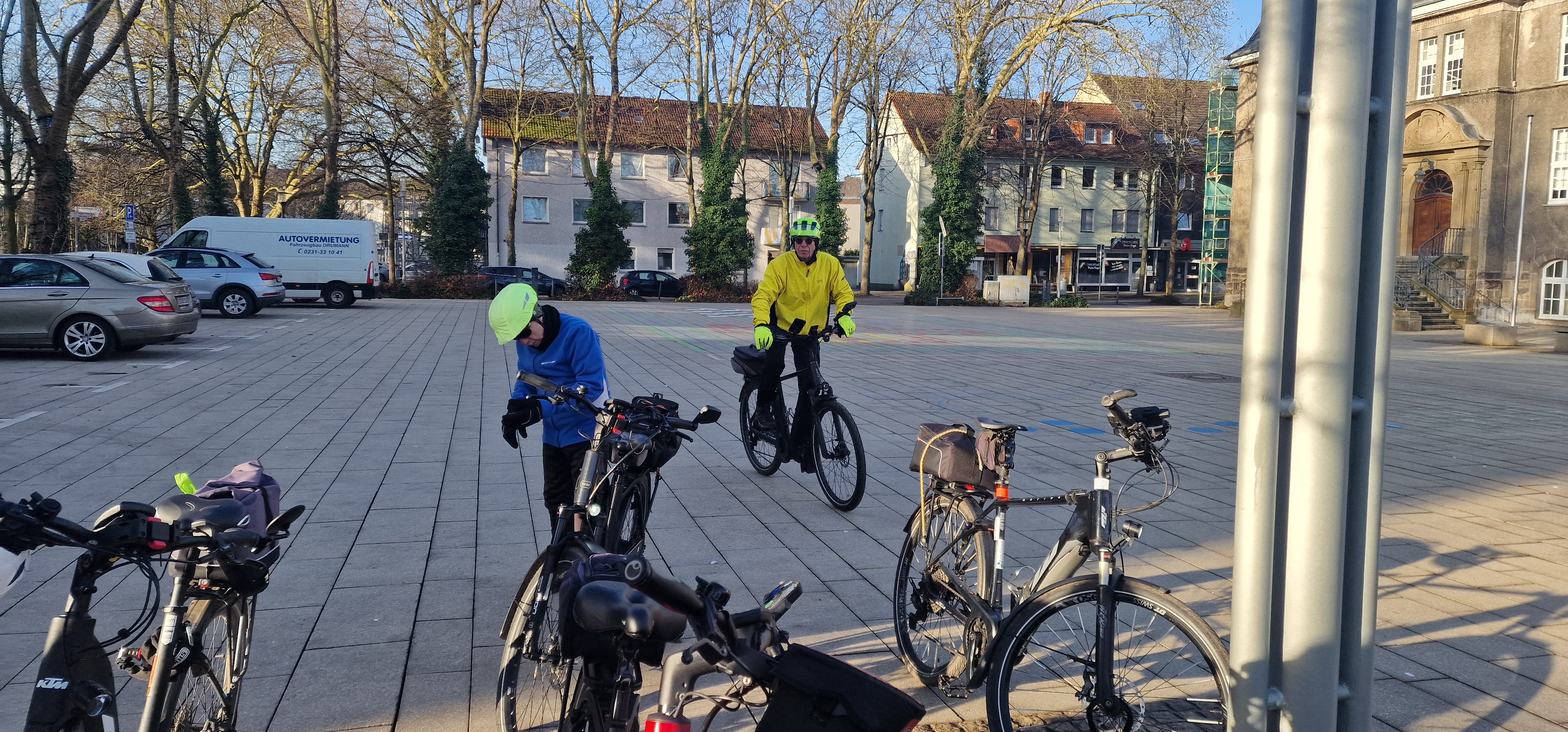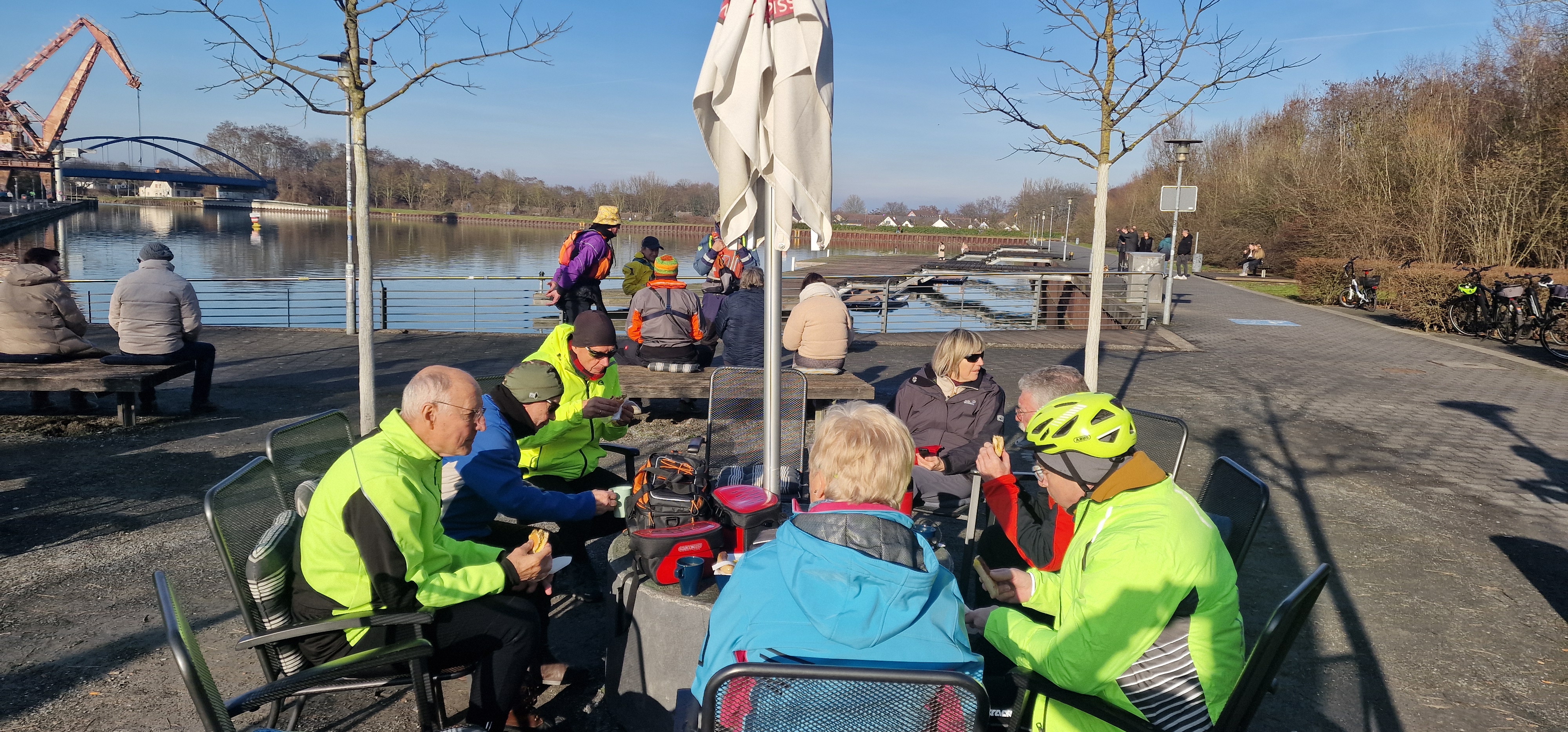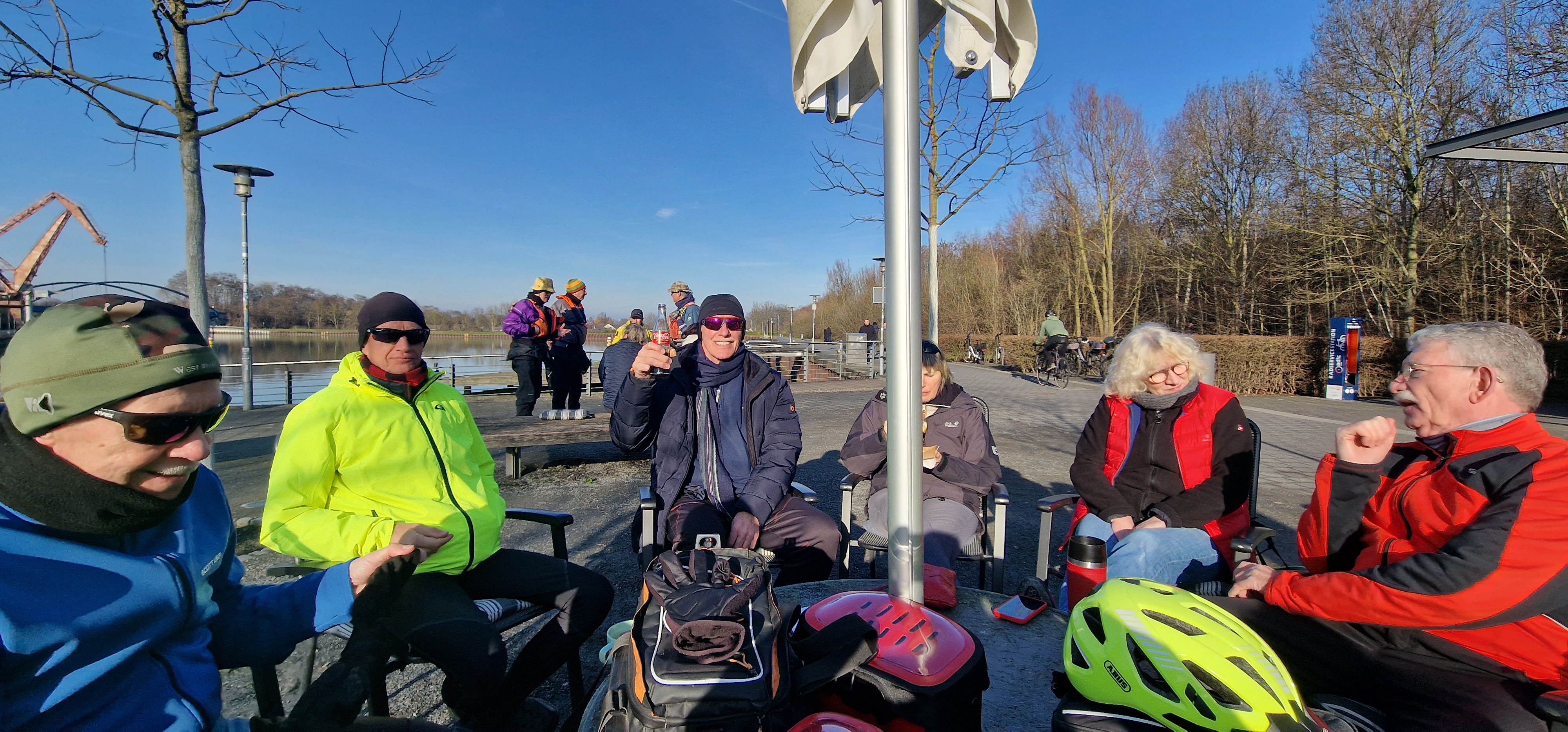 Elf Radler*innen trafen sich am Sonntag an dem gewohnten Treffpunkt in Holzwickede, um die ausgefallene Neujahrstour nachzuholen. Der Zielpunkt sollte der für die Neujahrstour geplante Ort, Preußen Hafen in Lünen, sein. Die Tour wurde von Rolf Bökenfeld, der auch der heutige Tourguide war, ein wenig angepasst. Die leichten Änderungen bescherten der Gruppe Orte, die sie vorher noch nicht gefahren sind. Ansonsten verlief die Tour zu Anfang wie gewohnt. Dem Verlassen von Holzwickede folgten die Wege über Asseln, Kurl, Niederaden und dem Seseke Radweg zum Preußen Hafen in Lünen. Hier wurde eine ausgiebige Pause eingelegt. Trotz des blauen Himmels und dem Sonnschein waren die Temperaturen eher winterlich. Da bereiteten die warmen Imbisse und Getränke eine Wohltat. Nach einer gemütlichen Pausenrunde ging es auf dem Rückweg in Richtung Gahmen, an der Zeche Gneisenau vorbei in Richtung Scharnhorst. Auf dem Uferweg Kirchderner Bach erreichten wir die Schikane über den Bahnhof Do- Scharnhorst. Über Brackel und Asseln führte der Weg zum Flughafen und Holzwickede lag nicht mehr in weiter Ferne. An geeigneter Stelle beendete Rolf die Tour und wünschte allen Teilnehmer*innen einen guten Heimweg. Diese bedankten sich bei Rolf für die schöne, wenn auch kühle Tour. Allen hat die Tour gefallen und verschönerte den Sonntag.