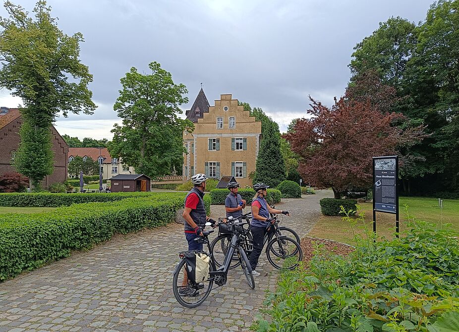 Die für den Sonntag geplante Tour musste wetterbedingt auf den Samstag verlegt werden. Zwölf Radler machten sich pünktlich um 10 Uhr auf den Weg über Hörde und den Bananenradweg durch ein lebhaftes Dortmund zum ersten Ziel, dem Dortmunder Hafen und dem alten Hafenamt. Lothar verlas dort die Zeitgeschichte über die Namensgebung der Stadt Dortmund. Weiter ging es durch das Hafengebiet an der Zeche Hansa vorbei zur Kokerei Hansa. Es lohnt sich, dort einmal eine Führung zu buchen. Das nächste Ziel am Weg war das ehemalige Schloss Westhusen, heute ein Seniorenheim. Auf Zeche Westhusen konnten wir ein einmaliges Bauwerk besichtigen, einen Förderturm der nicht aus Eisen sondern aus Stein gemauert ist. Durch Waldgebiet führte die Route zum Schloss Boldelschwingh, welches allerdings zur Zeit renoviert wird und nicht besichtigt werden konnte. Tief im Wald führte die Route an der Familiengruft derer von Boldelschwingh vorbei, auf eine der höchsten Erhebungen im Umkreis (147m), der Berghalde Schwerin mit der markanten Landmarke, bestehend aus Stahlsteelen, die eine Sonnenuhr darstellen. Ein Hauch von Stonehenge in Castrop. Endlich erreichten wir nach schöner Abfahrt das Mittagsziel, wo Lothar vorab einen Tisch reserviert hatte: Tante Amanda. Nach langer Pause und sehr gutem Essen führte die Tour zur Zeche Zollern. Ein Blick durch das Eingangstor vermittelte einen imposanten Eindruck von einem Industriedenkmal der Sonderklasse. Einige Kilometer später machten wir kurzen Halt im Innenhof von Haus Dellwig, welches baulich gesehen sehr stark an Schloss Opherdicke erinnert. Kurz vor Dorstfeld hatte Elisabeth einen Platten und mit geeinten Kräften und viel Geschick gelang es zunächst, den Schlauch zu flicken. Aber schon kurze Zeit später, auf dem Marktplatz in Dorstfeld, musste abermals repariert werden diesmal mit Pannenspray. Und auch dieser hielt nur für wenige Kilometer, sodass wieder eine Reparatur anstand. Aber selbst der neue Schlauch hatte ein defektes Ventil und letztlich musste das Rad per Auto nach Holzwickede überführt werden. Die Tourteilnehmer waren stets gut gelaunt und erfreulich geduldig, ob der langen Reperaturversuche. Die Tour bleibt in jeder Hinsicht noch lange in Erinnerung, besonderen Dank gilt der hervorragenden Organisation durch Lothar.