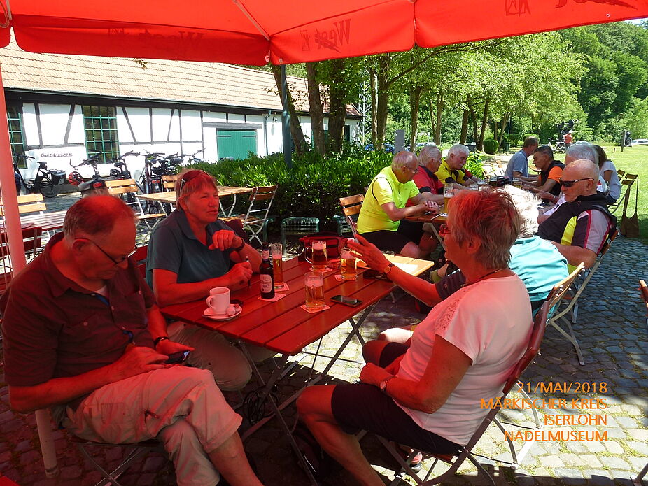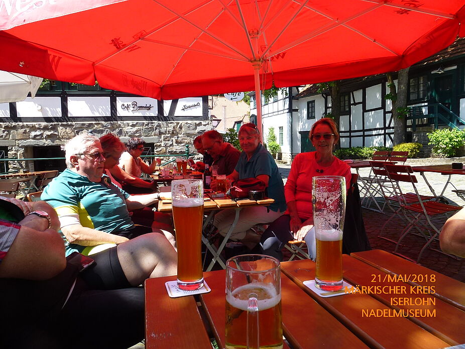 Pfingstmontag zehn Uhr am Markt und die Gruppe setzt sich, geleitet von Rolf Bökenfeld, in Bewegung um 52 km zu radeln. Diesmal war das Ziel eine Schleife der "Ruhr-Lenne-Acht" zu fahren. Man konnte Mitglieder vom ADFC Unna und Sendenhorst begrüßen. Zuerst ging es Richtung Fröndenberg über Menden und Hemer nach Iserlohn. Es ging fast immer leicht bergauf. Rolf, der seine Sache wieder hervorragend gemacht hat, leitete dann die Gruppe in ein Café in Iserlohn. Hier dachte man die Zeit wäre stehen geblieben. Der Kaffee und Kuchen war hervorragend. Es ging fast immer abwärts bis zum "Nadelmuseum". Nach kurzer Rast musste noch der Haarstrang bewältigt werden. Zum Ausklang ließ man sich noch ein Eis oder Eiskaffee im „Italy“ Holzwickede schmecken.